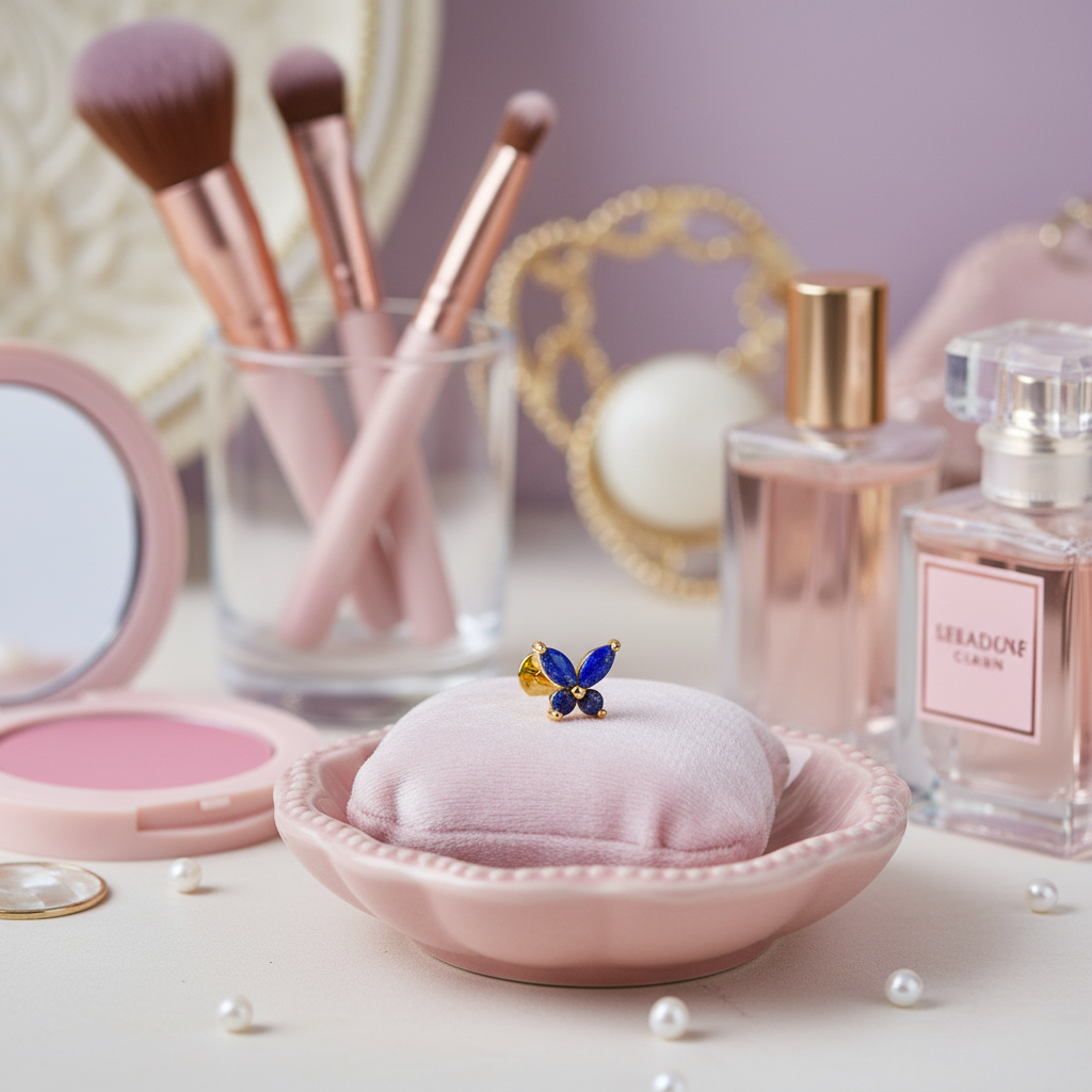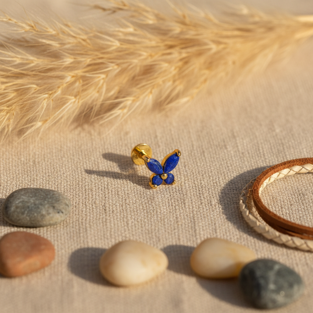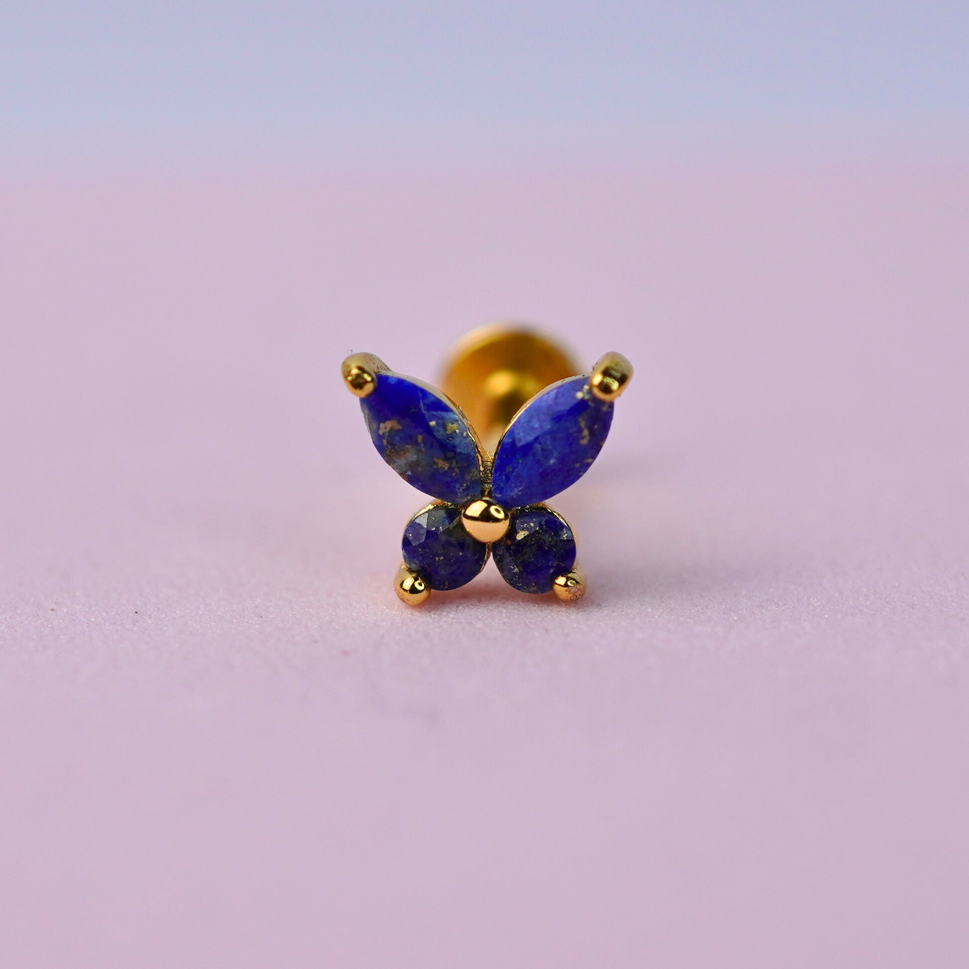 The genuine lapis lazuli displays stunning deep royal blue hues that evoke the beauty of the night sky, often with subtle golden pyrite flecks that add natural character. The mixed stone shapes create dimensional interest and movement, bringing the butterfly design to life. The flat back design with screw-back closure ensures maximum comfort and security for all-day wear in lobe, cartilage, tragus, or helix piercings.