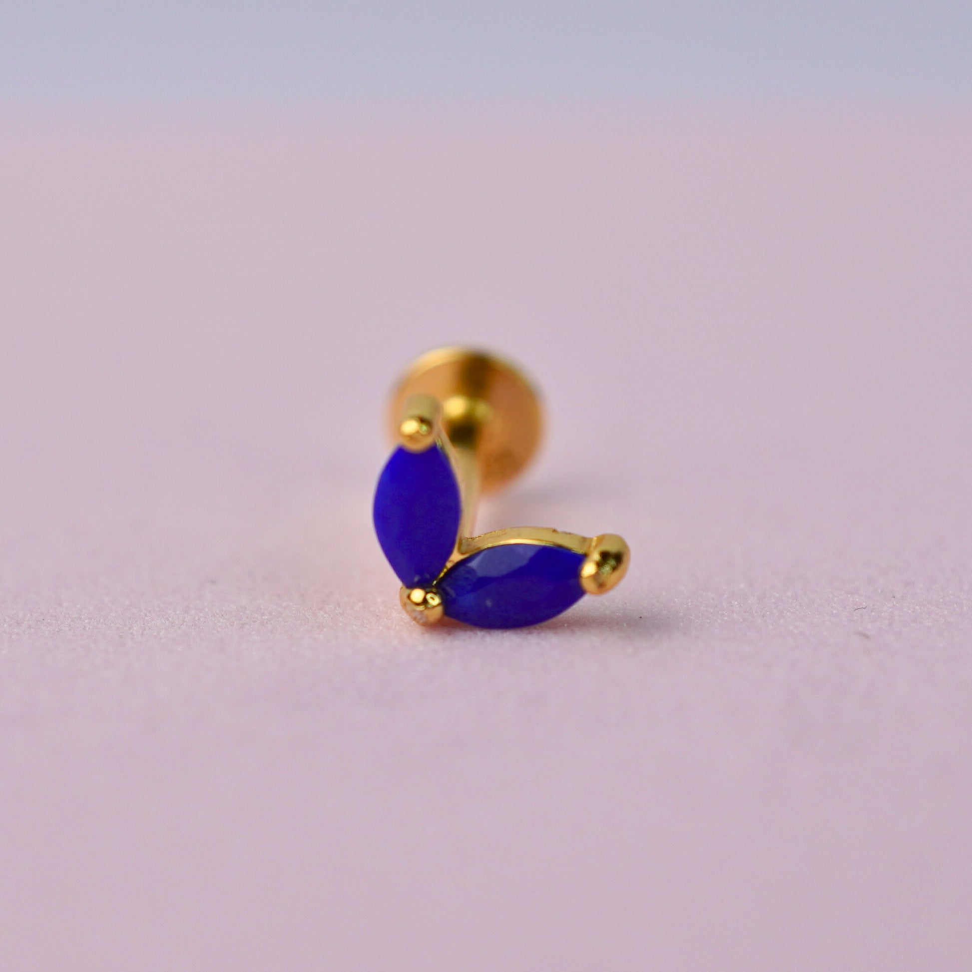 The genuine lapis lazuli displays stunning deep blue hues that evoke the beauty of the midnight sky, often with subtle golden pyrite flecks that add natural character. The two elongated marquise cuts are arranged in a graceful curve, creating an elegant and eye-catching silhouette. The flat back design with screw-back closure ensures maximum comfort and security for all-day wear in lobe, cartilage, tragus, or helix piercings.