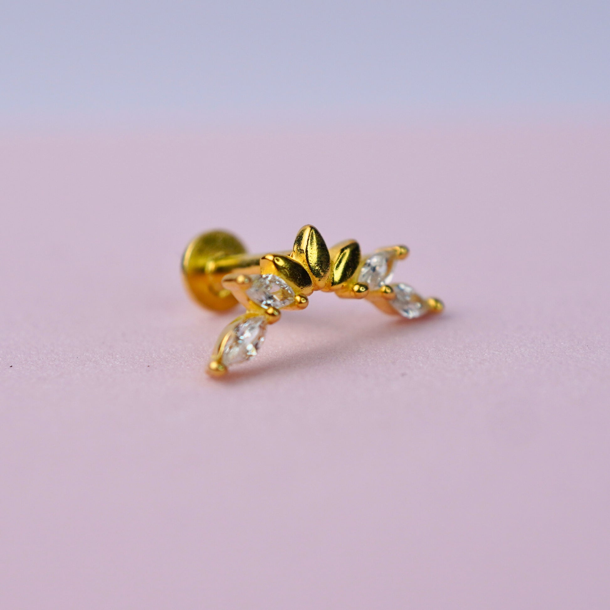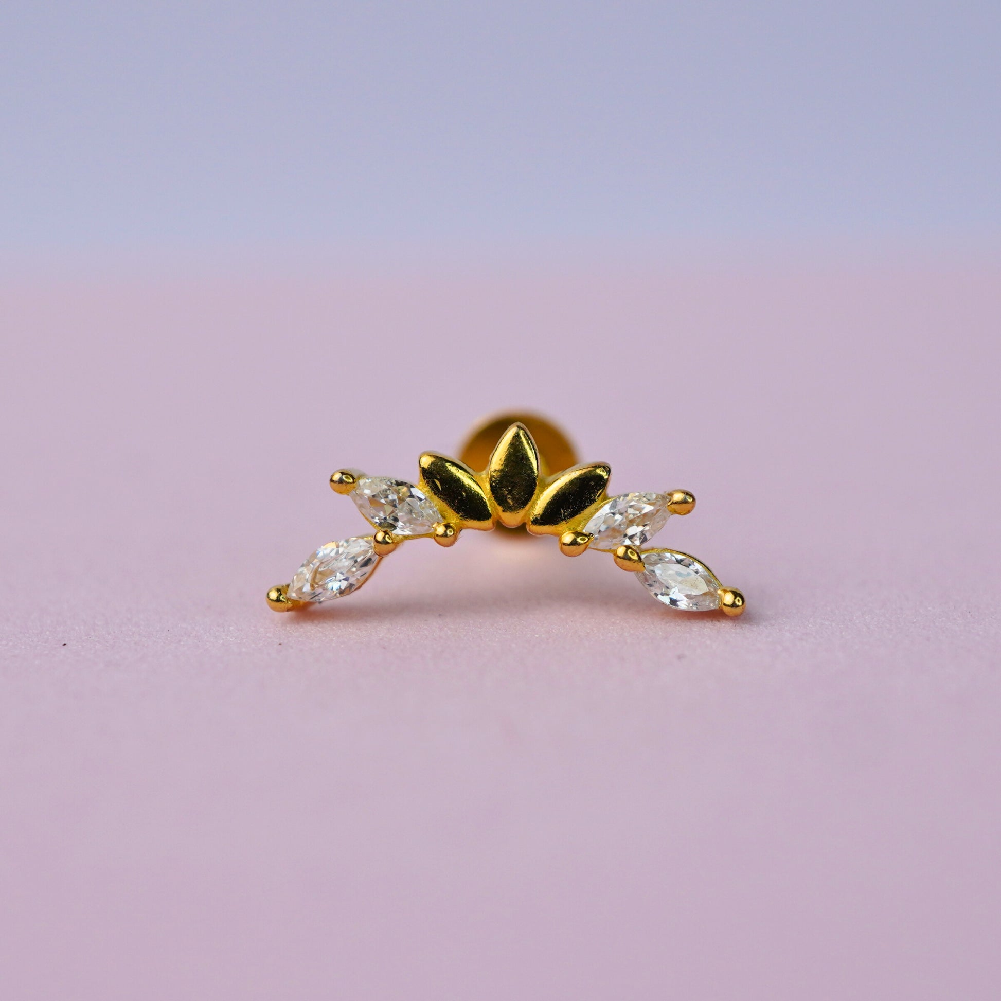 The dimensional petals create a charming focal point, while the sparkling cubic zirconia stones add brilliant shine and movement. The curved design creates a flattering silhouette that follows the natural contour of the ear. The flat back design with screw-back closure ensures maximum comfort and security for all-day wear in lobe, cartilage, tragus, or helix piercings.