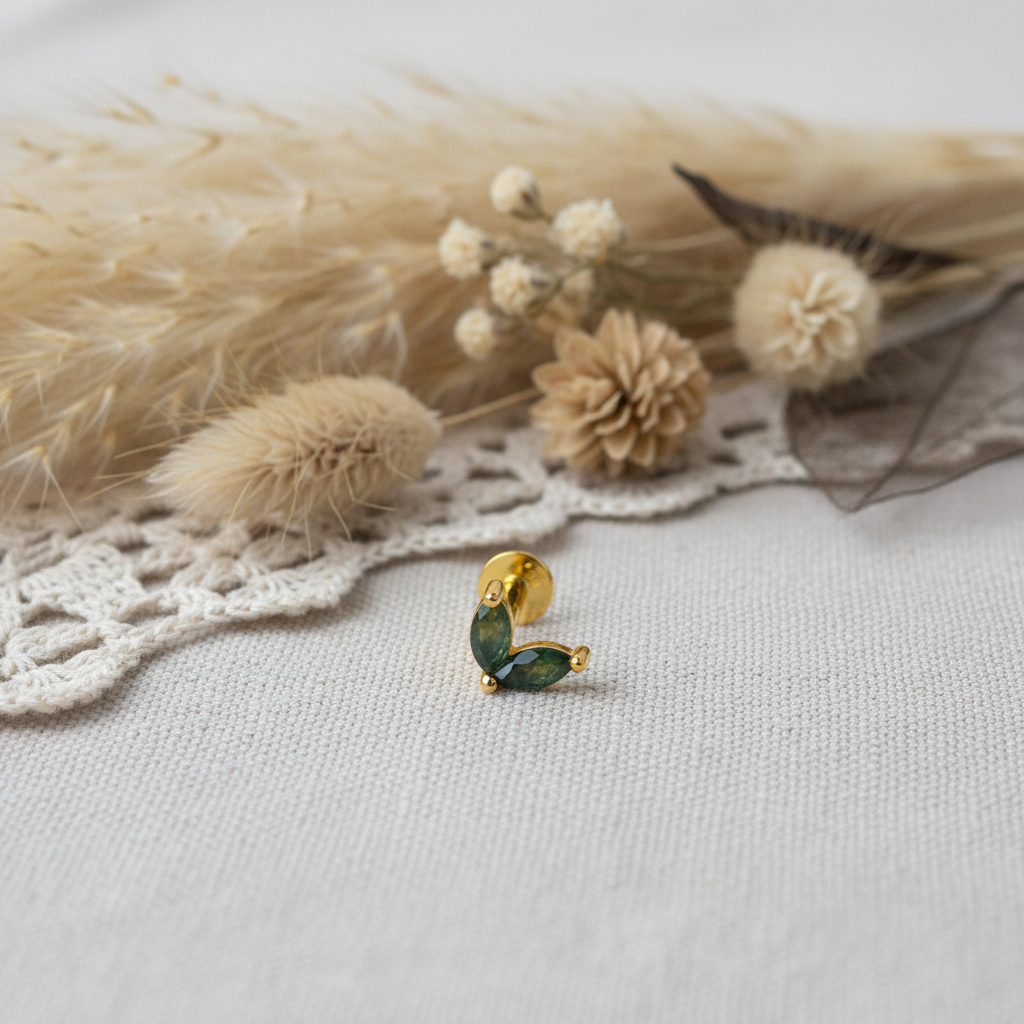 The genuine moss agate displays beautiful earthy tones and unique patterns that make each piece truly one-of-a-kind. The marquise cut creates an elongated, elegant silhouette that flatters the ear beautifully. The flat back design ensures maximum comfort for all-day wear, making it perfect for lobe, cartilage, tragus, or helix piercings.