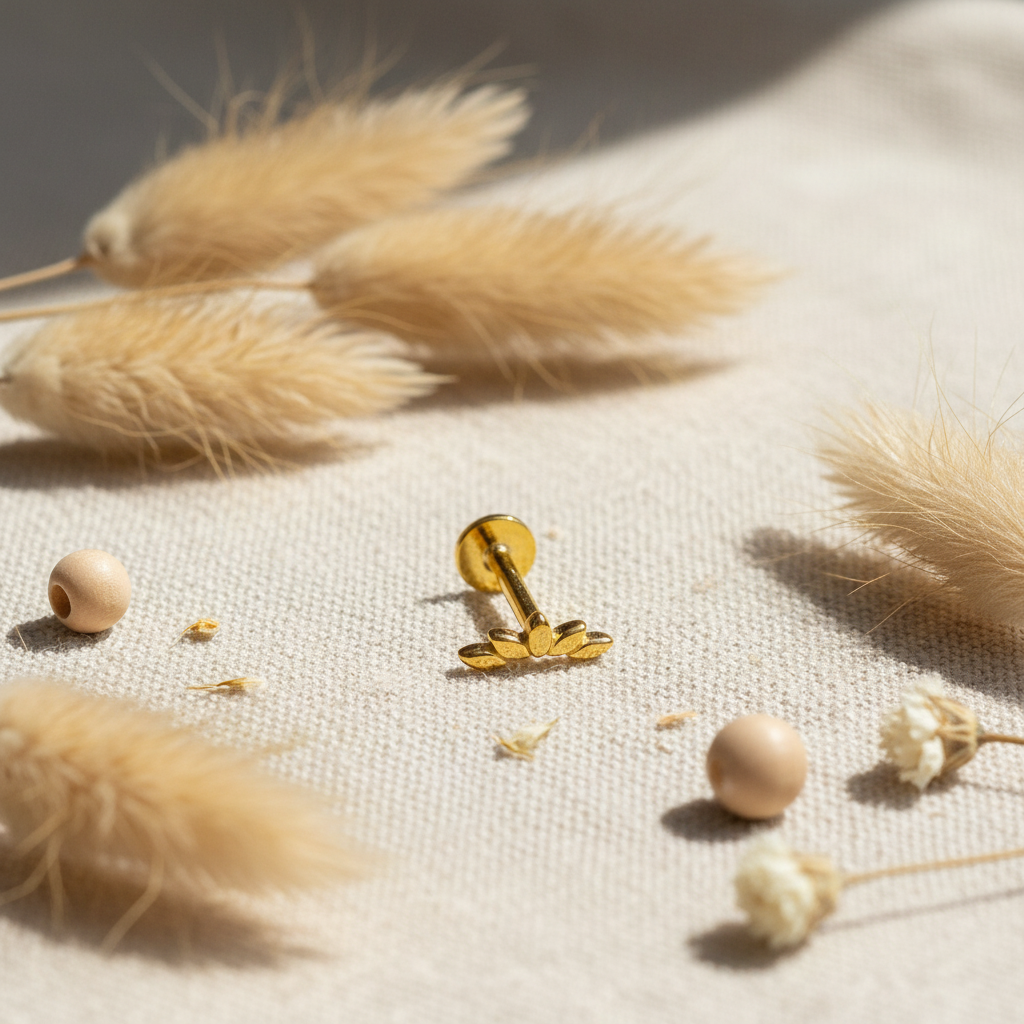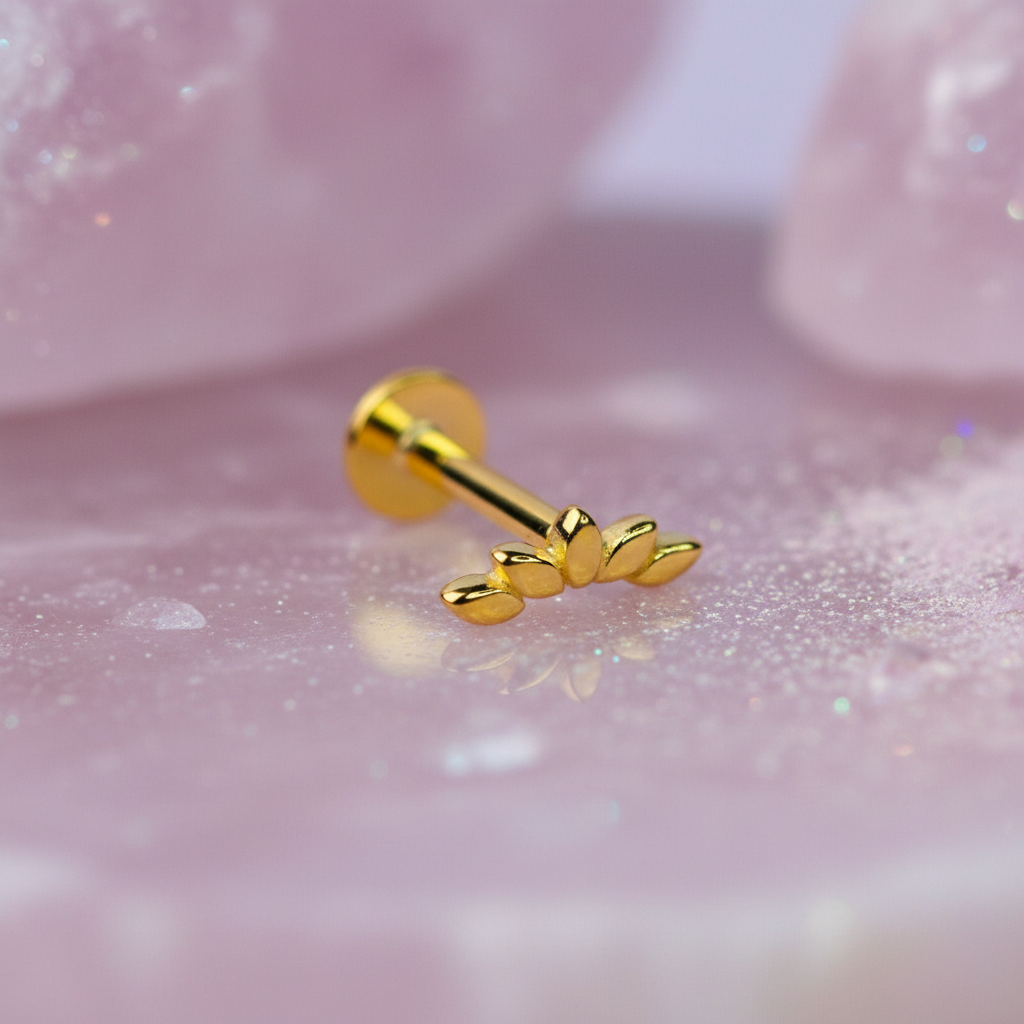 The dimensional petals catch the light beautifully with their polished finish, creating subtle movement and visual interest. The elegant curved arrangement creates a flattering silhouette that follows the natural contour of the ear. The flat back design with screw-back closure ensures maximum comfort and security for all-day wear in lobe, cartilage, tragus, or helix piercings.