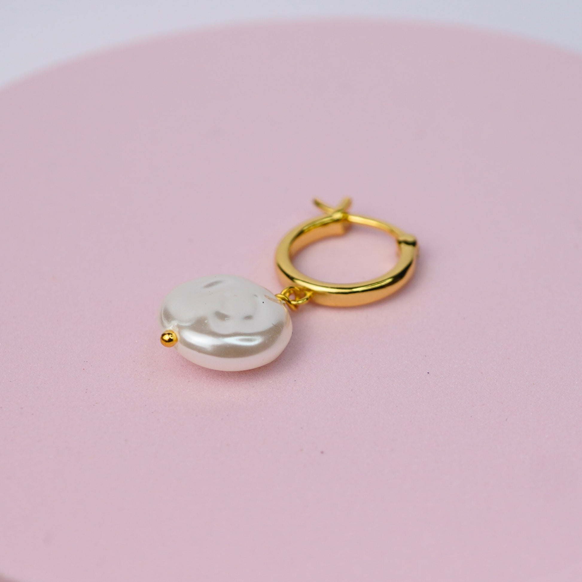 Embrace organic elegance with these stunning hoop earring featuring a lustrous freshwater pearl charm, beautifully crafted from 925 sterling silver with luxurious 14k gold plating. This sophisticated piece showcases a natural baroque coin pearl with its unique, irregular shape and beautiful iridescent sheen, suspended from a sleek polished hoop.