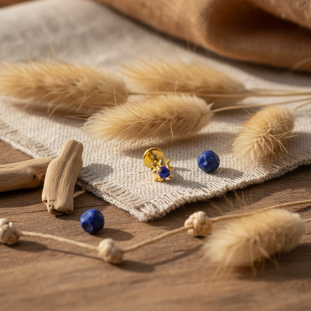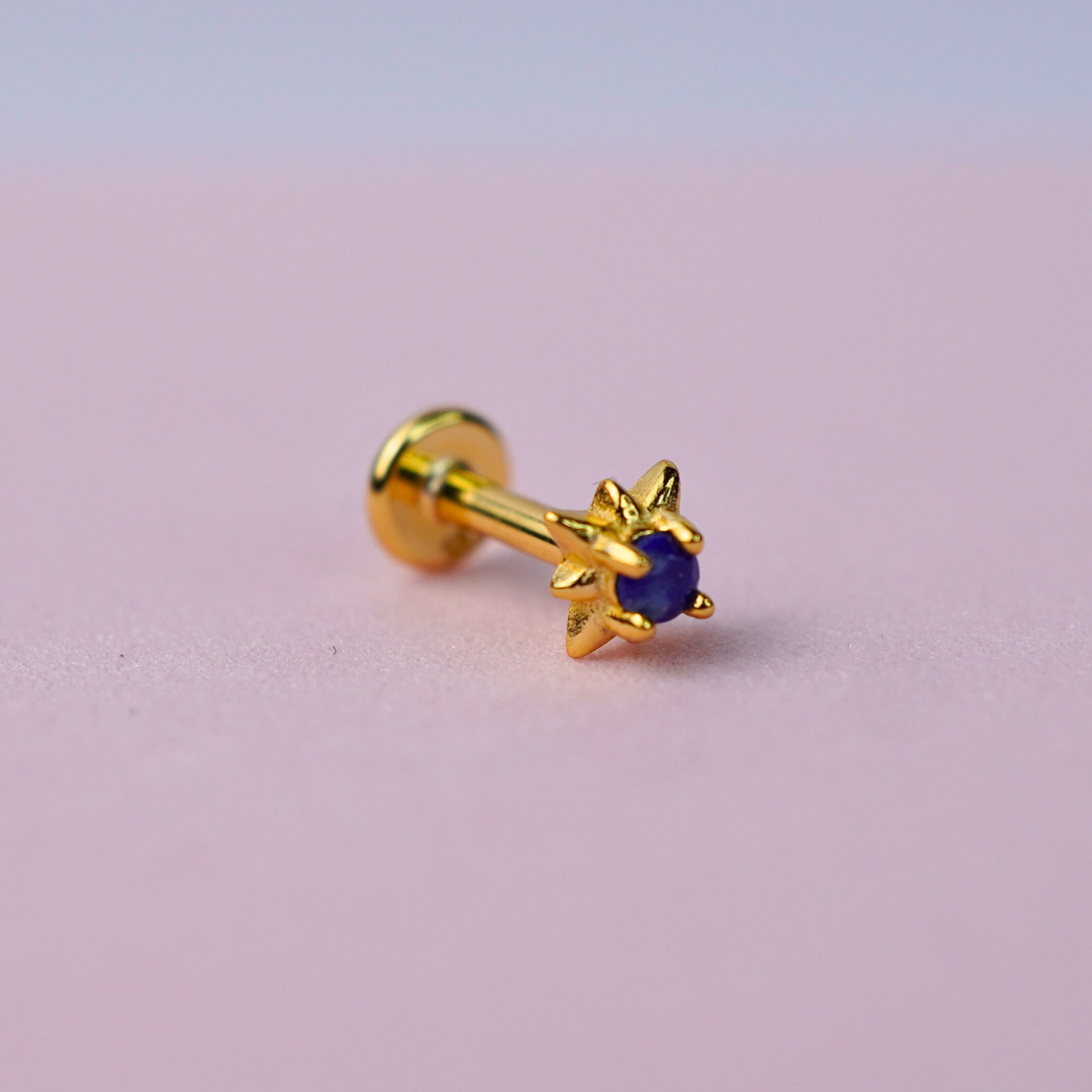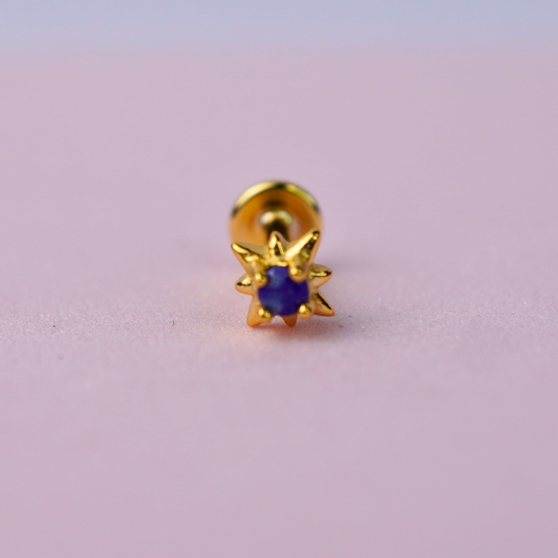 The genuine lapis lazuli displays stunning royal blue hues that evoke the night sky, while the distinctive star prongs create a celestial-inspired design that adds magical charm. The dimensional star setting catches the light beautifully, creating a whimsical and eye-catching effect. The flat back design with screw-back closure ensures maximum comfort and security for all-day wear in lobe, cartilage, tragus, or helix piercings.