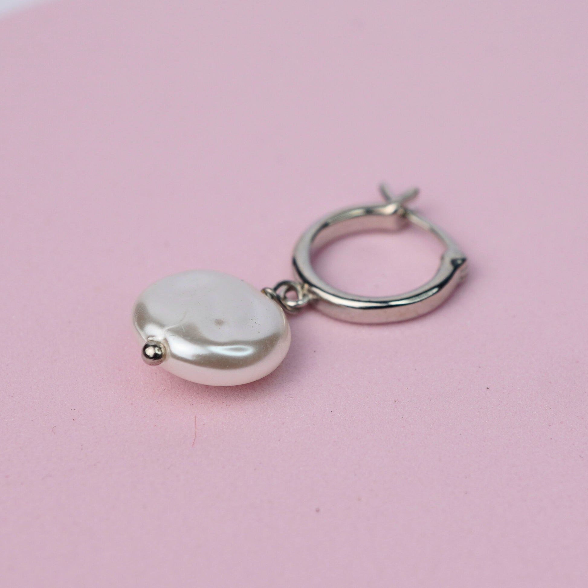 Huggie Hoop Earrings with flat Pearl Charm - Sterling Silver