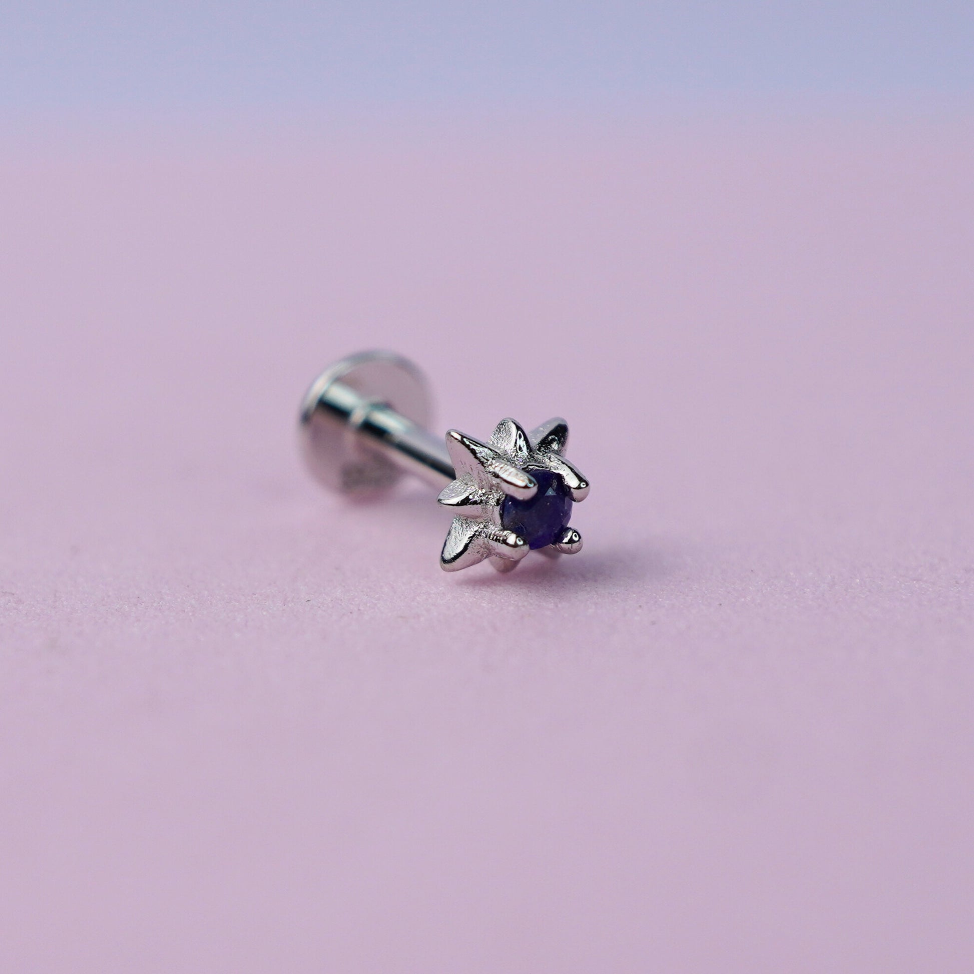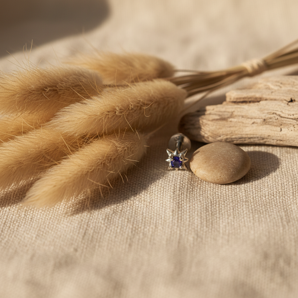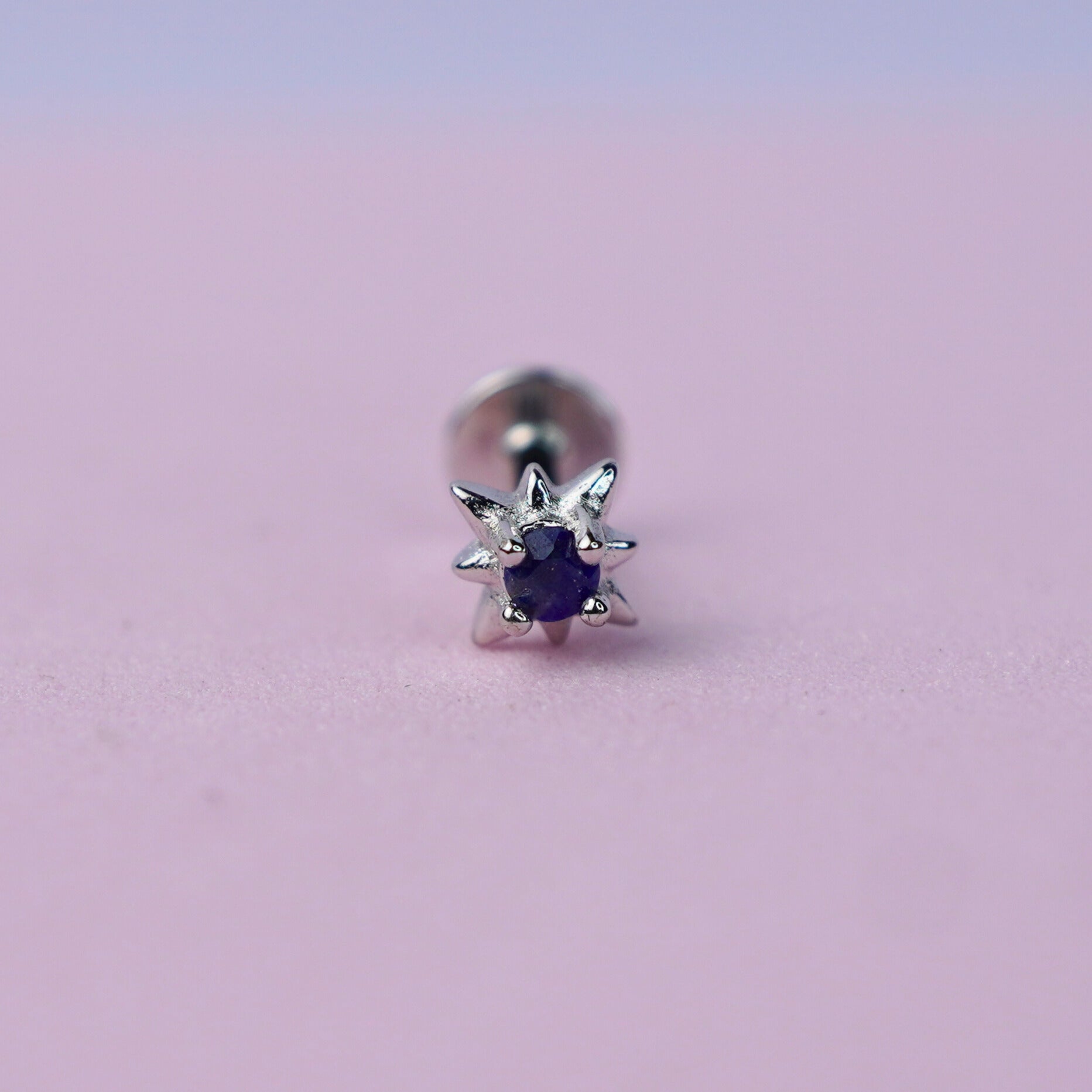 The genuine lapis lazuli displays stunning royal blue hues that evoke the night sky, often with subtle golden pyrite flecks that add natural character. The distinctive star prongs create a celestial-inspired design that adds magical charm and sparkle. The dimensional star setting catches the light beautifully, creating a whimsical and eye-catching effect. The flat back design with screw-back closure ensures maximum comfort and security for all-day wear in lobe, cartilage, tragus, or helix piercings.